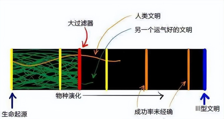 大过滤器理论认为,在从没有生命的荒芜之地到扩张性的星际文明的漫长演进过程中,存在着一个或多个极其难以跨越的障碍,这些障碍就像一个个过滤器,无情地阻挡着生命向更高层次发展。汉森将这一演进过程大致划分为九个关键阶段:
